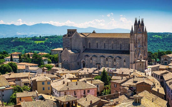 Orvieto, UmbriaOrvieto is situated on the flat summit of a large butte of volcanic tuff, one of the most dramatic townscapes in Europe, rising above the vertical cliffs that are extended by defensive walls of the same stone. The facade of the Duomo of Orvieto, a masterpiece of Italian gothic art, is equally spectacular, consisting of bands of black and white stone decorated with bronze dragons, gold mosaics and marble bas-reliefs by Lorenzo Maitani. Other sights in and near Orvieto are the deep spiral Well of St. Patrick (Pozzo di San Patrizio) and other caves and tunnels, some dating from Etruscan times. For a town of its size, Orvieto has some remarkably good restaurants. A must see for anyone visiting Umbria or southern Tuscany. Worth an extended visit. More about Orvieto. |